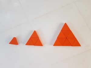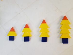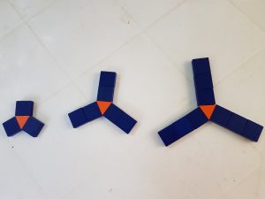 דגמים צומחים מוחשיים – ניתן לבנות דגמים צומחים בעזרת ריבועים צבעוניים, קביות, צורות הנדסיות שונות. בונים דגם והילדים מתבקשים לבנות את הדגם הבא בסדרה. למשל, אשפר לבנות דגם של גרמי מדרגות כאשר בגרם הראשון יש מדרגה אחת בלבד, השני יש שתי מדרגות, השלשי שללוש ואז מבקשים מהילדים להמשיך ובנות את הבא אחריוץ בהמשך בודקים כמה לוחיות היו דרושות כדי לבנות כל גרם, וממלאות טבלה המסכמת את כמות הלוחיות בכל אחד מגרמי המדרגות
